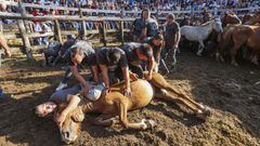 «A polo cabalo! Ide a polo cabalo!», gritaba el público desde la grada. Pero la tarea no era fácil. Si ya no lo es tumbar a una yegua salvaje para cortarle las crines, mucho menos lo es intentarlo con el macho de la manada. Pero a fuerza de empeño y trabajo en equipo, se consiguió. Vaya si se consiguió. Con más o menos técnica, con mayor o menor acierto, a veces a la primera y a veces tras varios intentos, pero los aloitadores fueron abriéndose paso y dándole al público la dosis justa de espectáculo que este ritual ancestral requiere. Porque en el fondo -exhibición y fiesta aparte- lo que uno ve en la rapa no es más que un ejercicio de aprecio y cuidado hacia estos animales que durante todo el año habitan, recorren y limpian el Monte Faro.